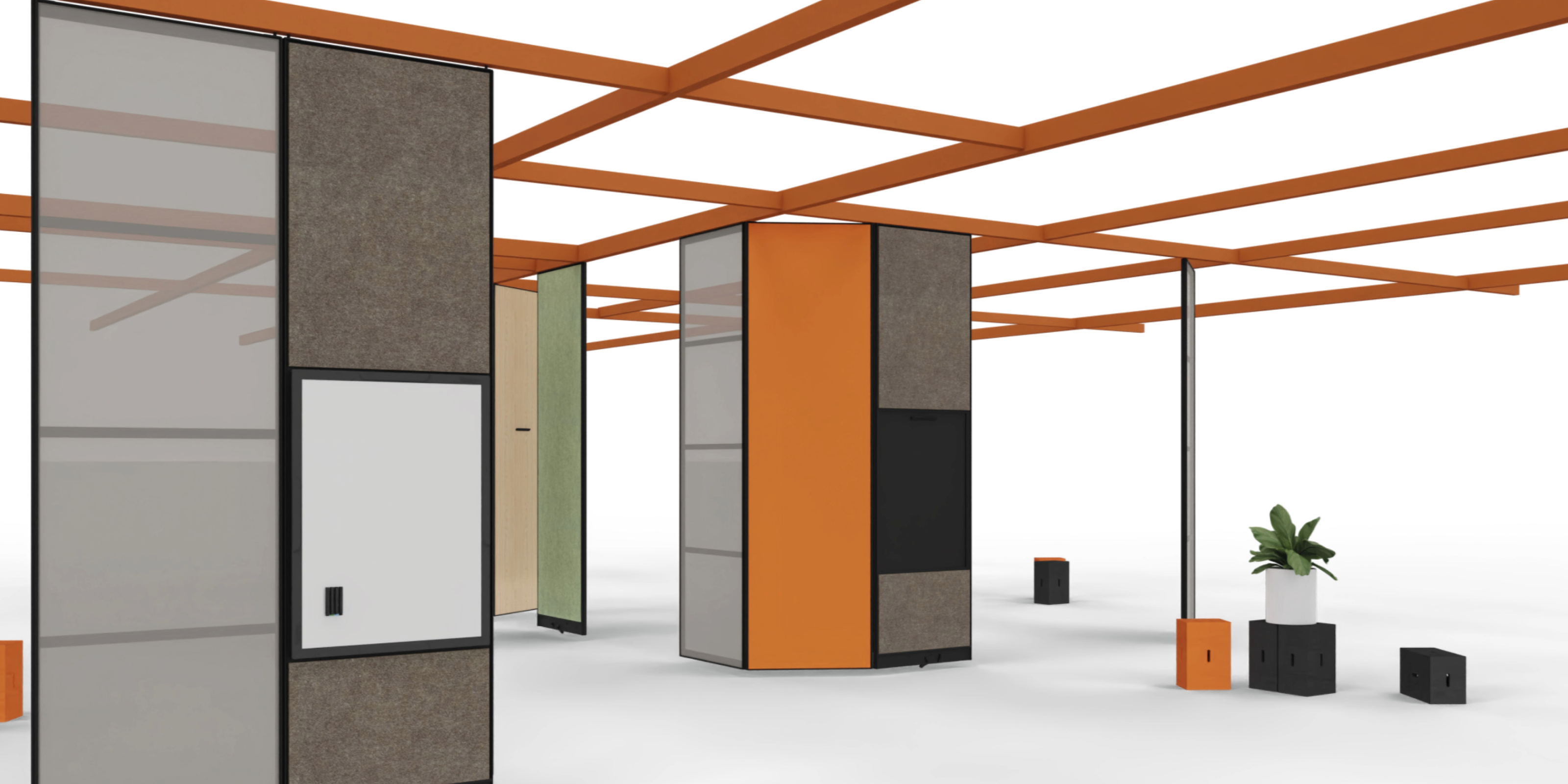 - Modular and reversible: Integrate partitions, acoustic elements or light rails – individually or combined, on multiple levels.