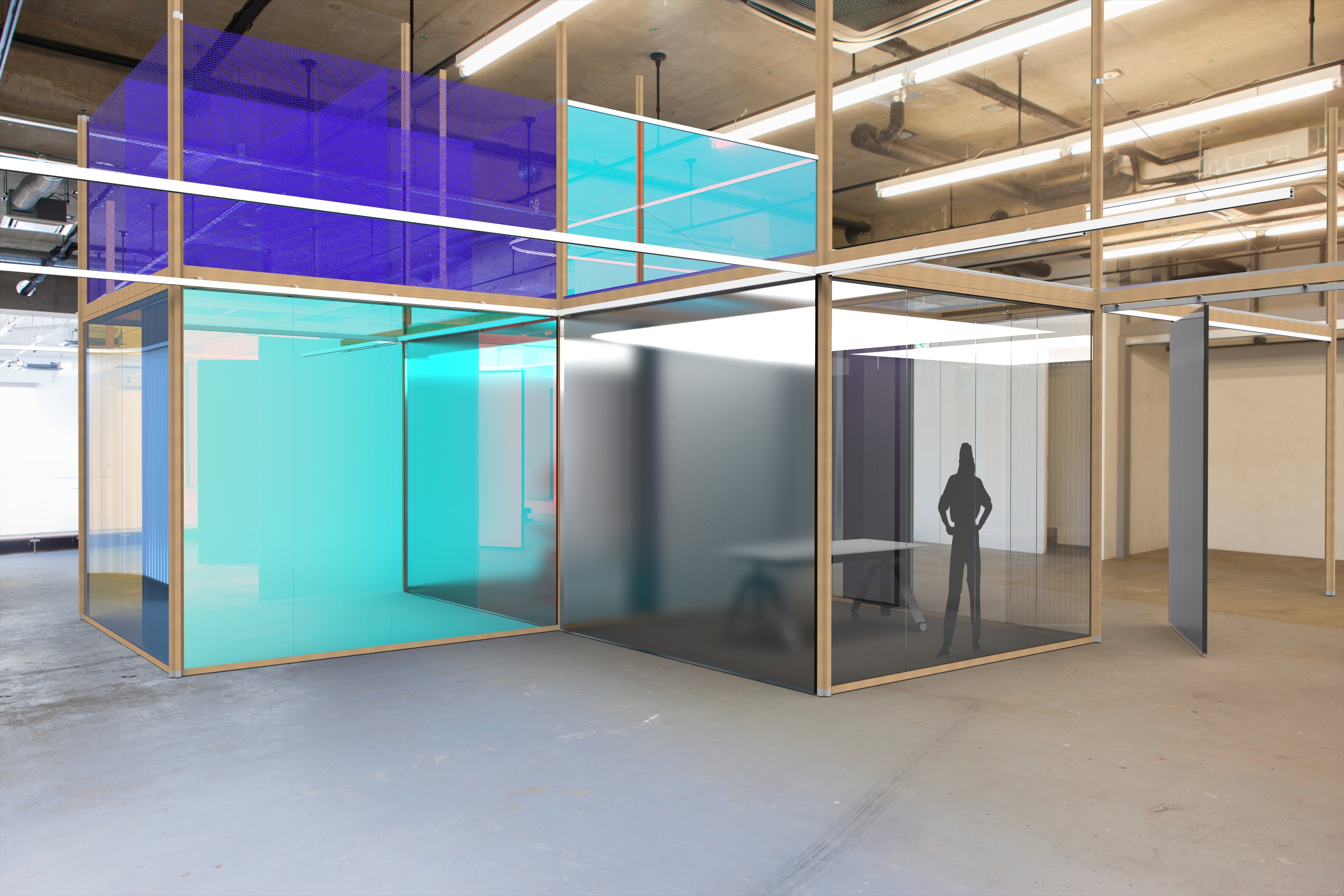 multistructure is an innovative, modular room system for the intelligent division of open, unzoned spaces into flexibly usable, dynamically adaptable rooms. At the heart of its development is a sustainable post-and-beam construction using locally sourced timber. The raised system is anchored exclusively within the building, thus minimally invasively impacting the existing structure.