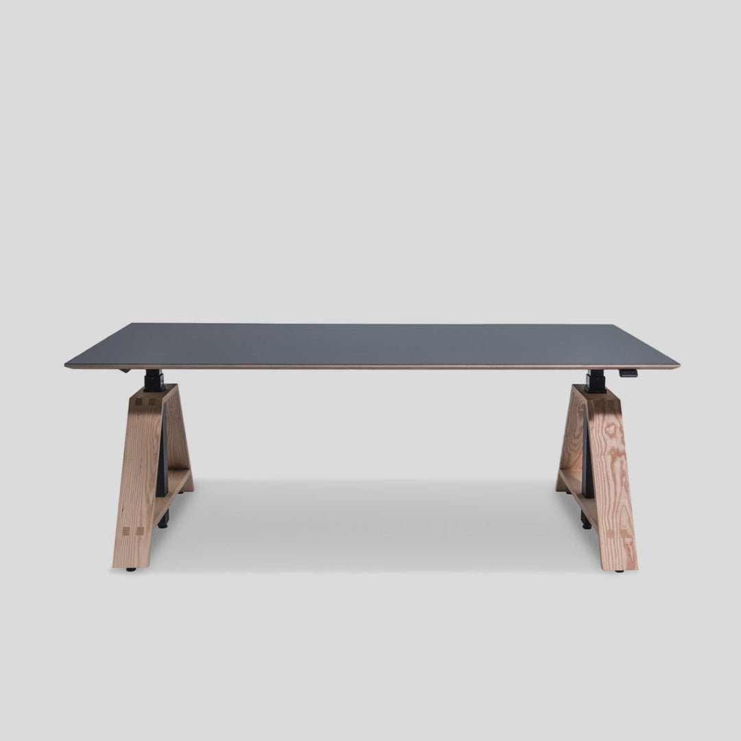 Die klare und reduzierte Formensprache verleiht der motu Designlinie einen eleganten und zeitlosen Eindruck. Die Arbeitsplatten sind in Linoleum, Holz oder Kunststoff in vielen Farben möglich. Den A-Fuß-Rahmen in der breiten Version gibt es vertraut aus Metall oder - ein Novum bei elektrisch höhenverstellbaren Tischen - aus Holz. In dieser Variante ist die Hubsäule für eine noch stabilere Geometrie in den A-Fuß-Rahmen integriert.