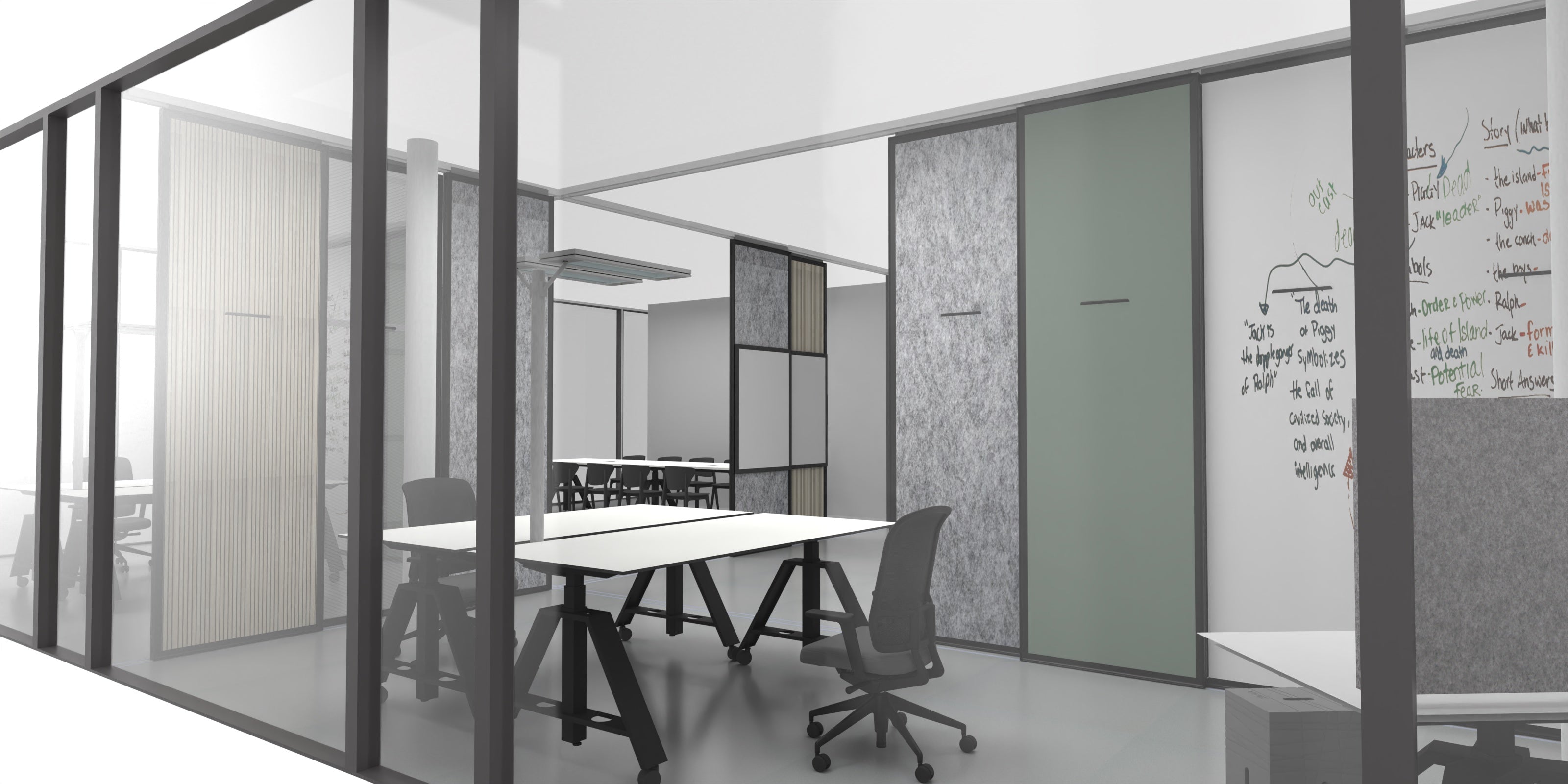 Die Boden-Decke geführte Schiebewand organisiert offene Bürolandschaften.