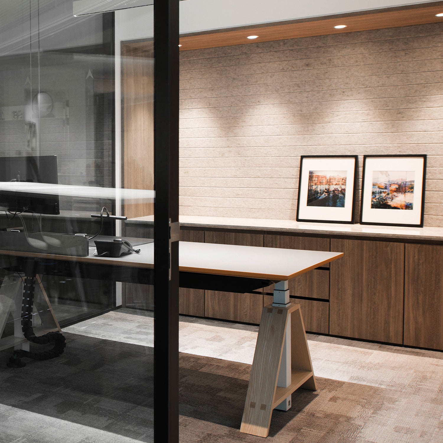 Die enorme Variabilität und Individualisierbarkeit des Büro- und Arbeitstisches ergibt sich aus der Kombination elektrisch höhenverstellbarer Hubsäule und der Bandbreite an Materialien.