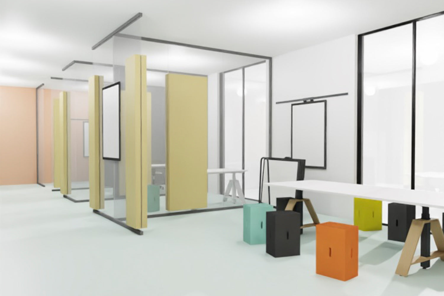 Eines der Hauptmerkmale dieses Raumsystems ist seine unglaubliche Vielseitigkeit. Es kann in verschiedenen Umgebungen eingesetzt werden, sei es in Büros, Schulen, Konferenzräumen oder anderen Räumlichkeiten. Die Anpassungsfähigkeit dieses Systems ermöglicht es jeden Raum optimal zu nutzen. Dank der Möglichkeit, verschiedene Farben und Materialien zu kombinieren, können Sie Ihr Raumdesign individuell anpassen. Egal ob Sie eine lebendige und inspirierende Umgebung für kreative Arbeit schaffen oder eine ruhige und professionelle Atmosphäre für Besprechungen bevorzugen - die Gestaltung liegt in Ihren Händen.