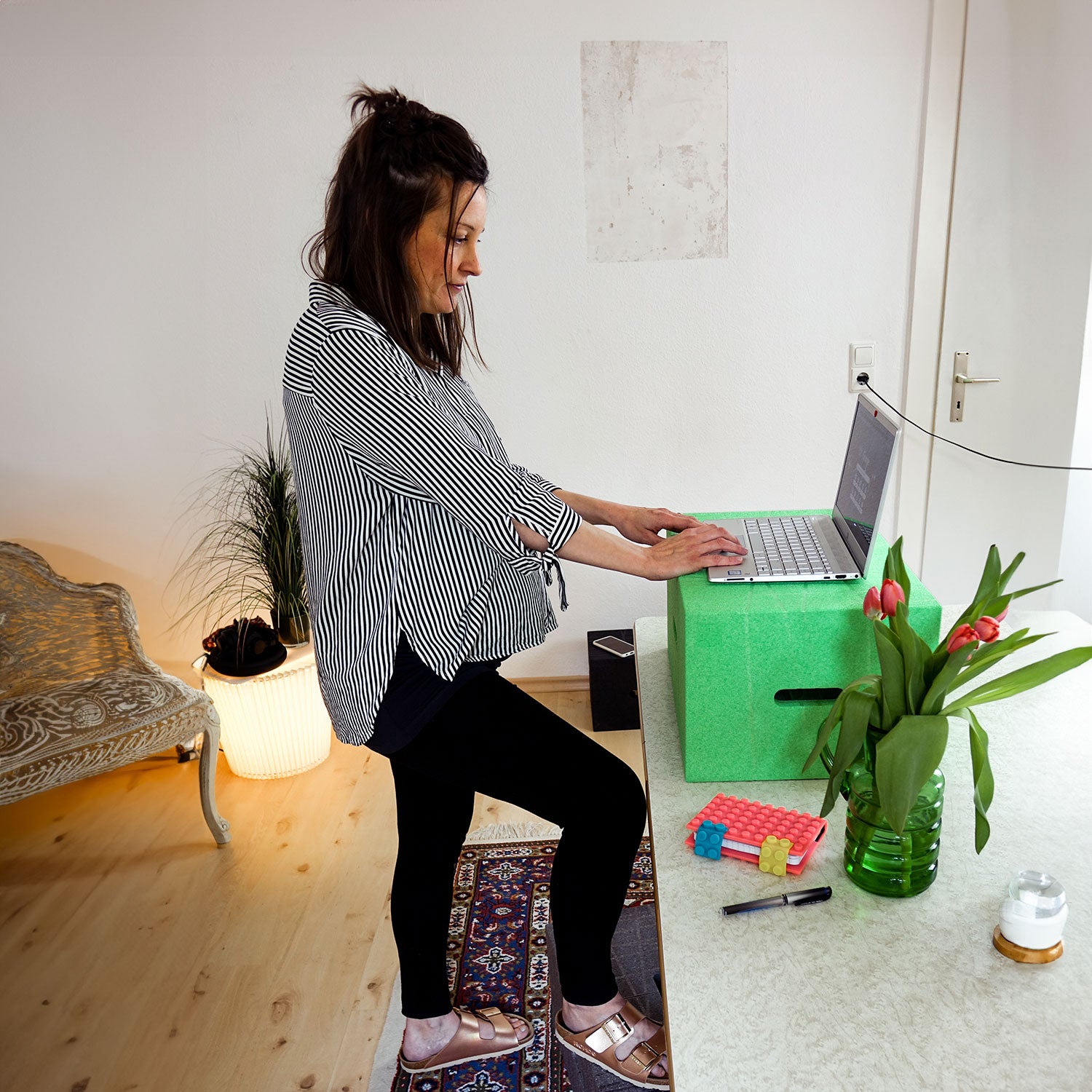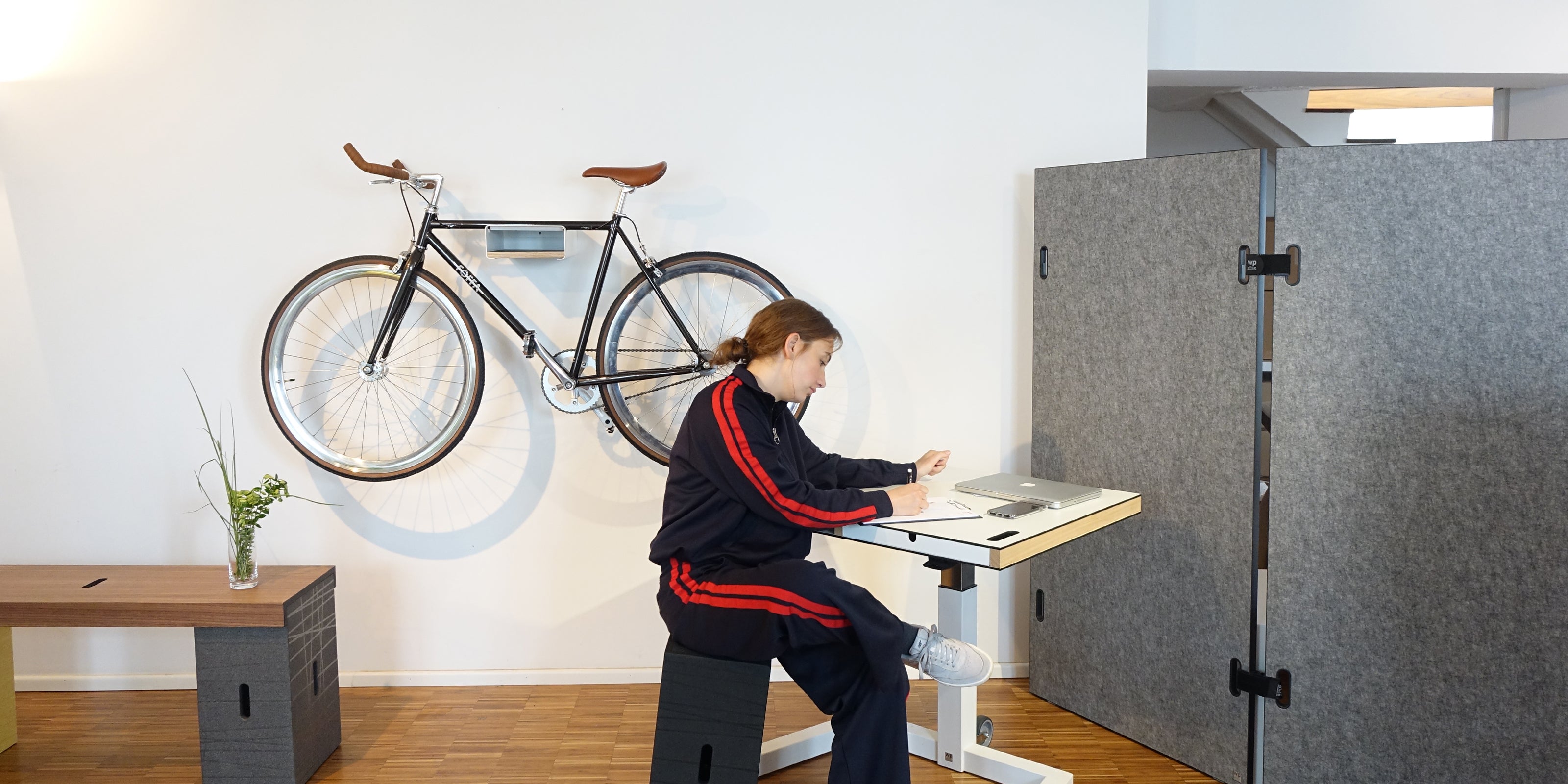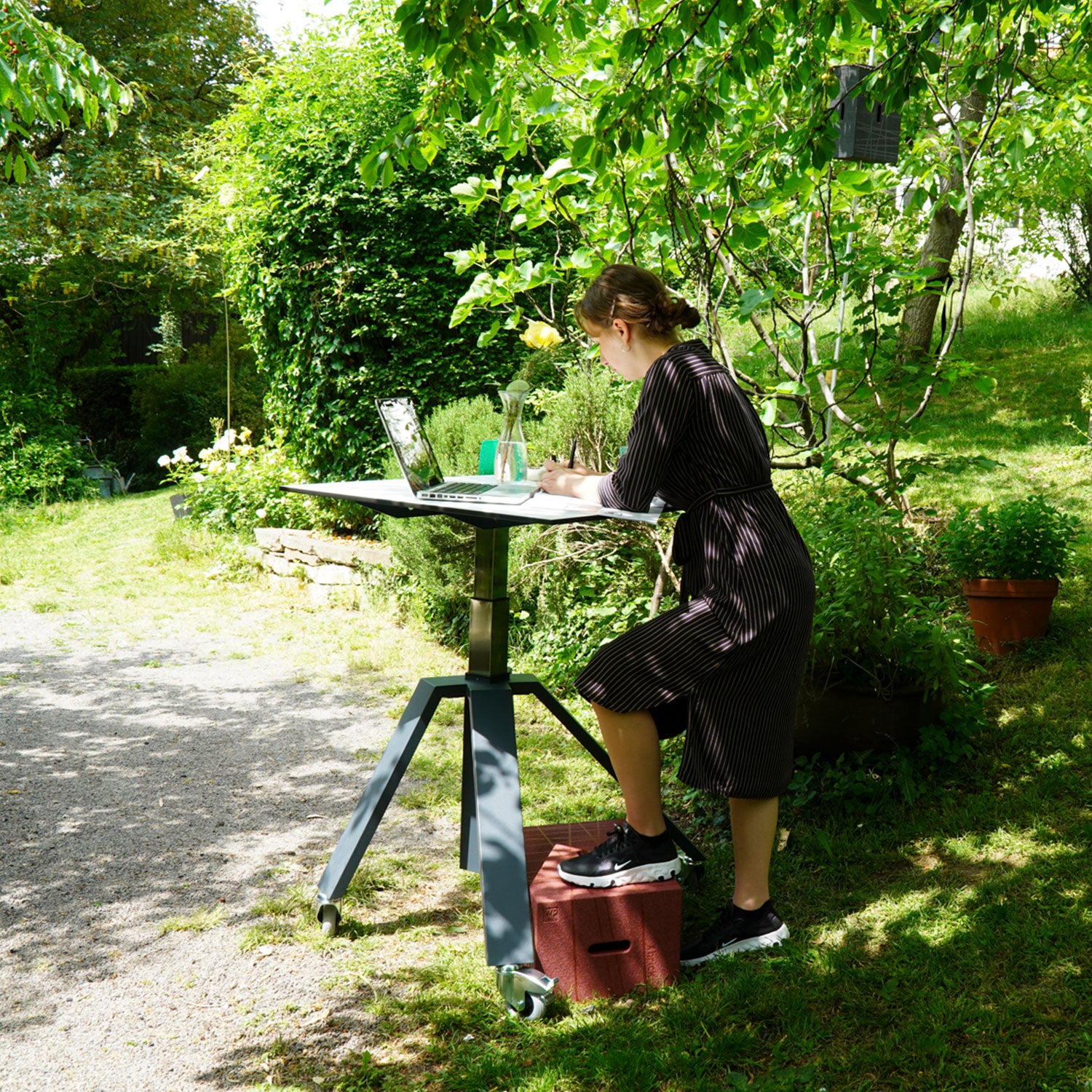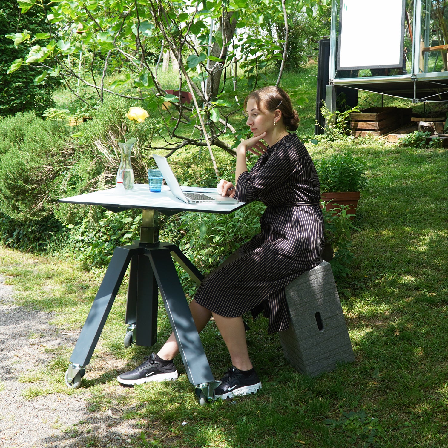 Der Anspruch an unsere Kleinstarbeitsplätze: selbstverständlich höhenverstellbar! Mechanisch und ohne Strom kann somit überall ergonomisch gearbeitet werden, entweder in der richtigen Sitzhöhe oder im Stehen – drinnen und draußen. Der Wechsel zwischen stehen und sitzen regt den Kreislauf an - der Perspektivwechsel am Schreibtisch schafft die nötige Aktivität, um kreative Lösungsansätze zu finden und innovative Ideen zu entwickeln.