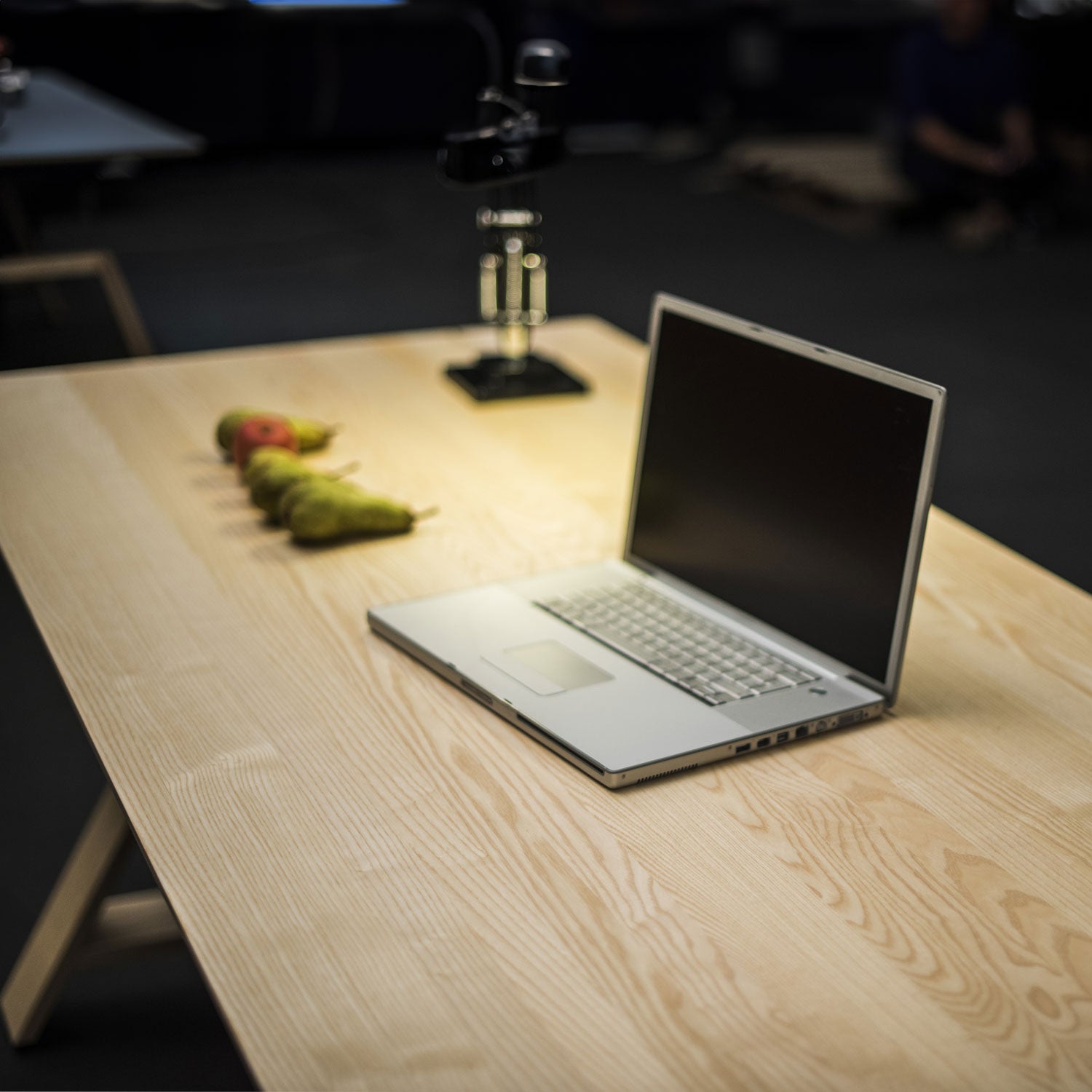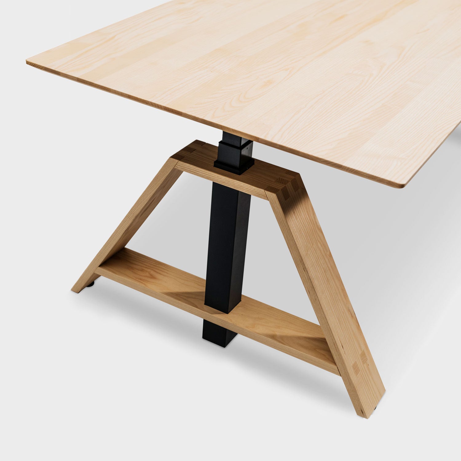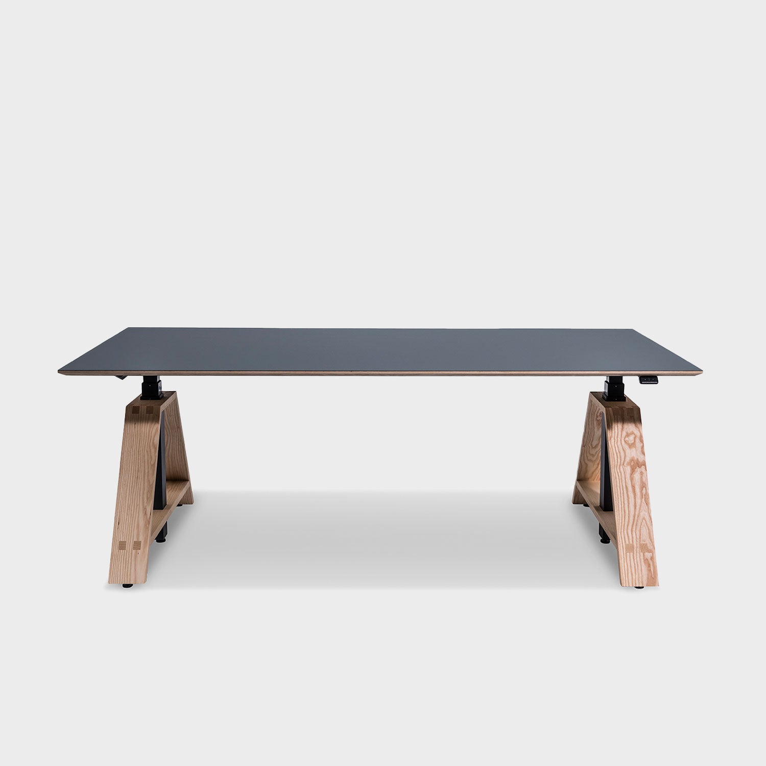 Die enorme Variabilität und Individualisierbarkeit des Büro- und Arbeitstisches ergibt sich aus der Kombination elektrisch höhenverstellbarer Hubsäule und der Bandbreite an Materialien.