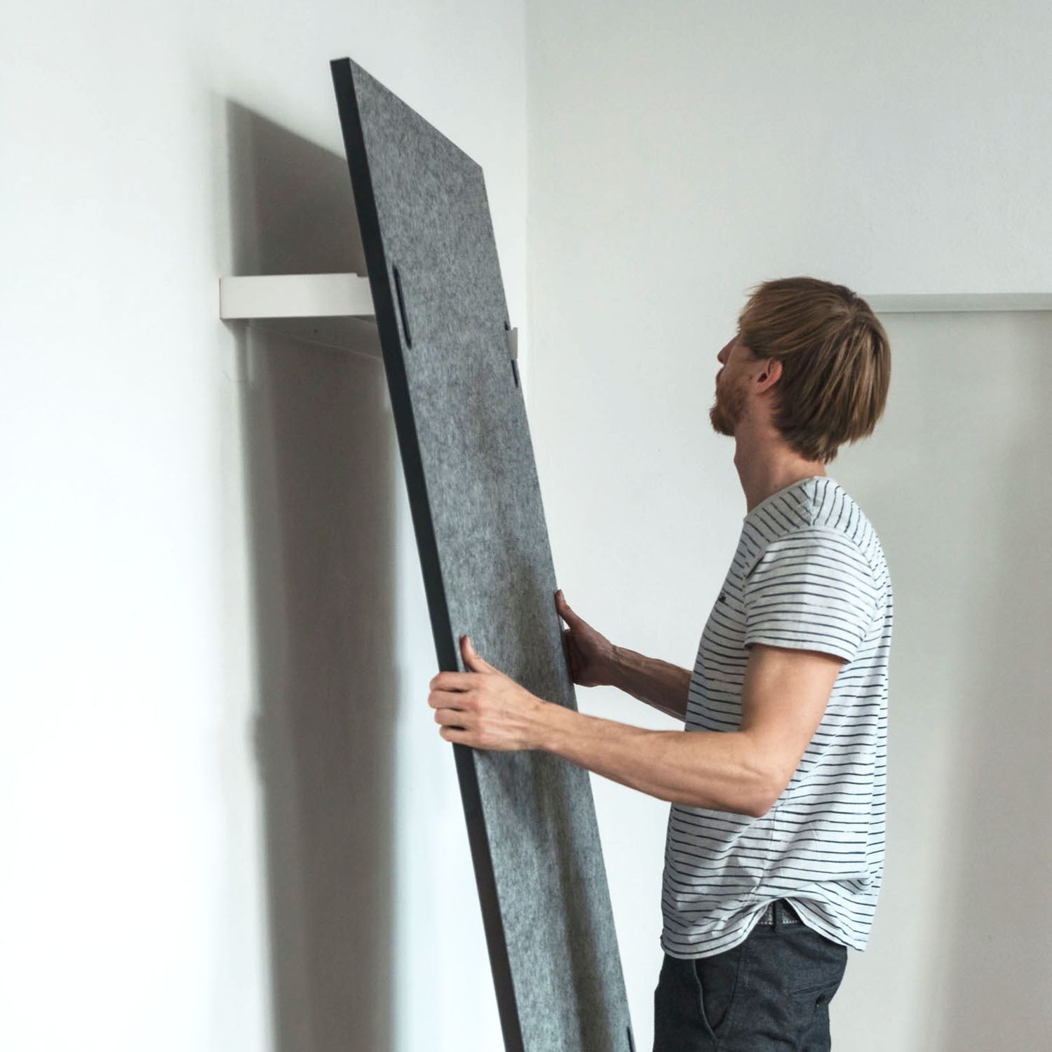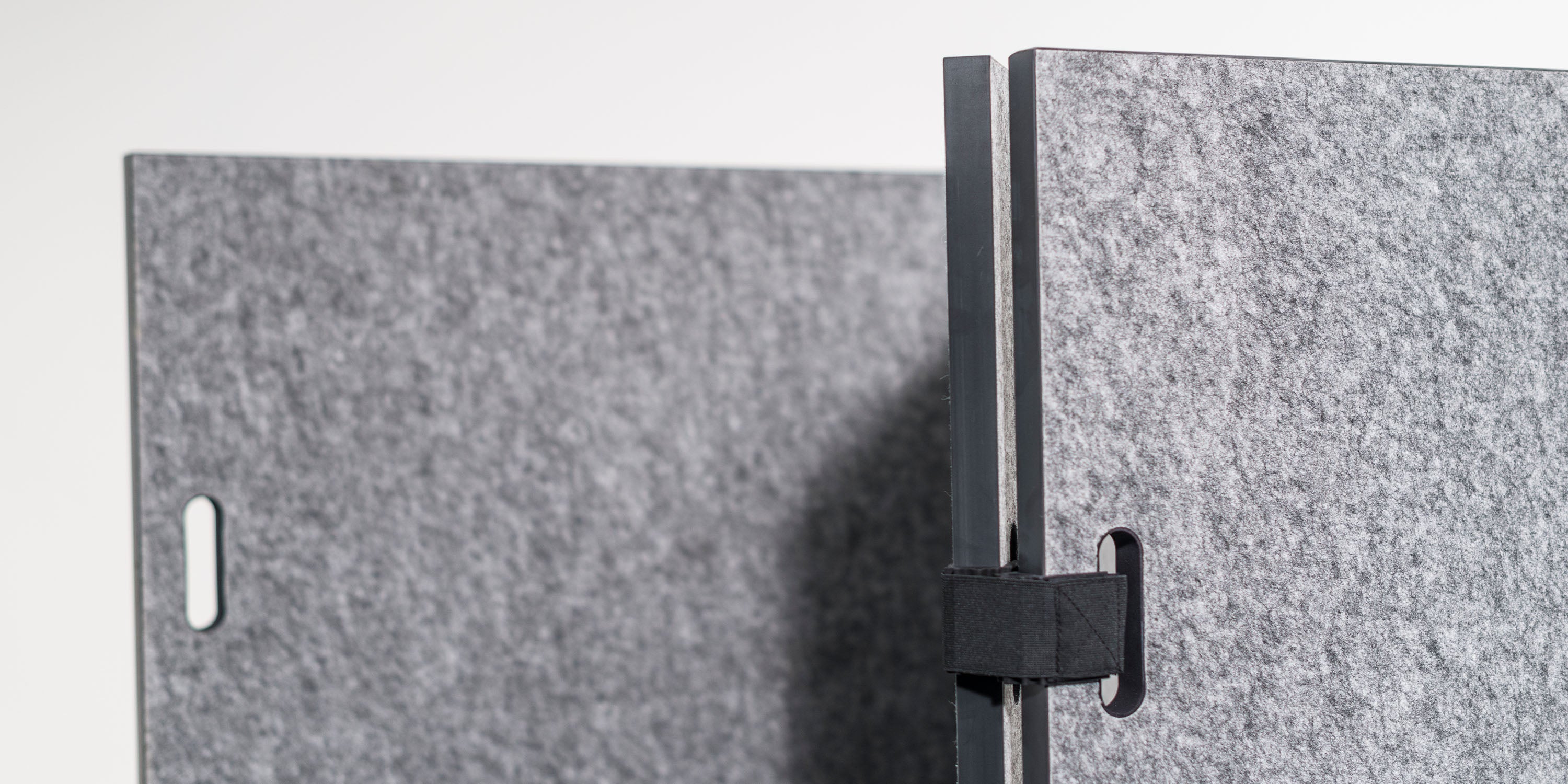 Diese Akustik Trennwand aus PET-Filz wird nicht einfach irgendwo in der Arbeitslandschaft abgestellt und nie mehr bewegt. Denn dank ihrer Leichtigkeit und leichten Handhabung lässt sie sich schnell und mühelos dorthin platzieren, wo sie zur Zonierung gerade gebraucht wird. Dafür sorgen Materialwahl und Konstruktion: Der PET-Filz bringt hohe Schallabsorptionseigenschaften mit. Und mit dem cleveren, einfach aufsteckbaren Zahnscharnier, das in den Grifflöchern sitzt, ist die Wand in jedem Winkel frei konfigurierbar. Und egal ob große Wand oder kleiner Tischabsorber, alle Akustikelemente aus Filz sind zugleich Pinnwand und Präsentationsfläche.