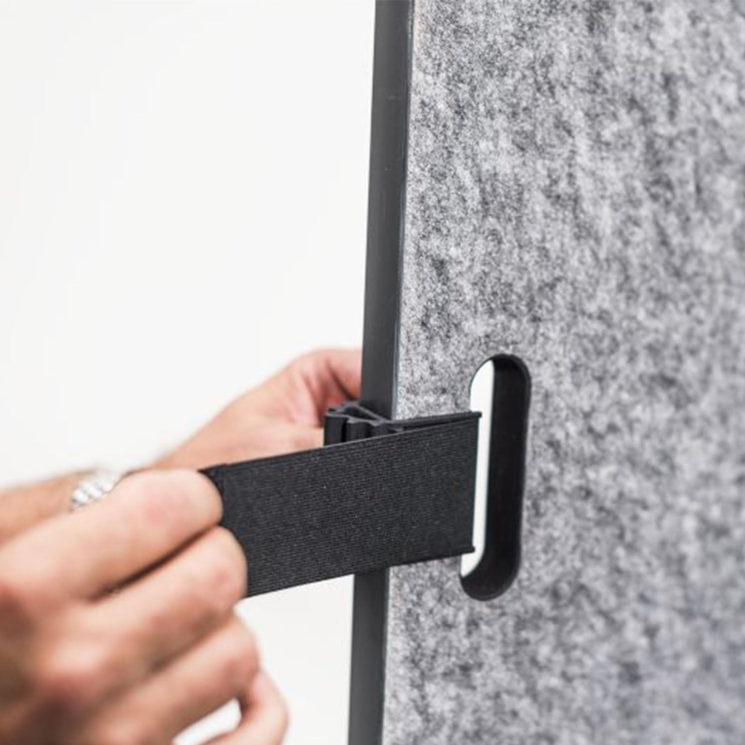 Mit praktischen Grifflöchern sind die motu Akustik Trennwände leicht und flexibel im Arbeitsbereich aufzustellen. Das motu Akustikschild wird per einfachem Klemmprinzip im Fußgestell befestigt. Einzelne Filzwände lassen sich mit Klettbändern zu Trennwänden verbinden. In unterschiedlichen Höhen und Breiten schirmen die Stellwände unterschiedliche Umgebungen ab. Sie minimieren den Geräuschpegel und tragen damit zur Verbesserung der Raumakustik bei.