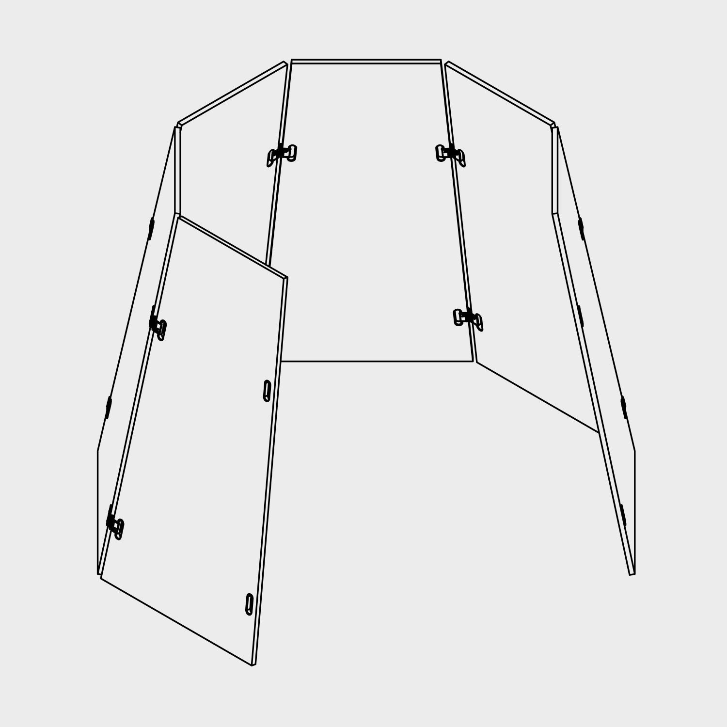 Das Akustikschild-Zelt lässt sich schnell und mühelos platzieren, wo Raumzonierung gerade gebraucht wird. Vier Filzplatten bilden einen Halbkreis mit etwa zwei Metern Durchmesser auf Bodenhöhe. Die Neigung der Platten zueinander lässt den Schall innen beziehungsweise außen vor. Es entsteht eine akustisch abgeschirmte Denkhülle in einer Urform der Architektur.