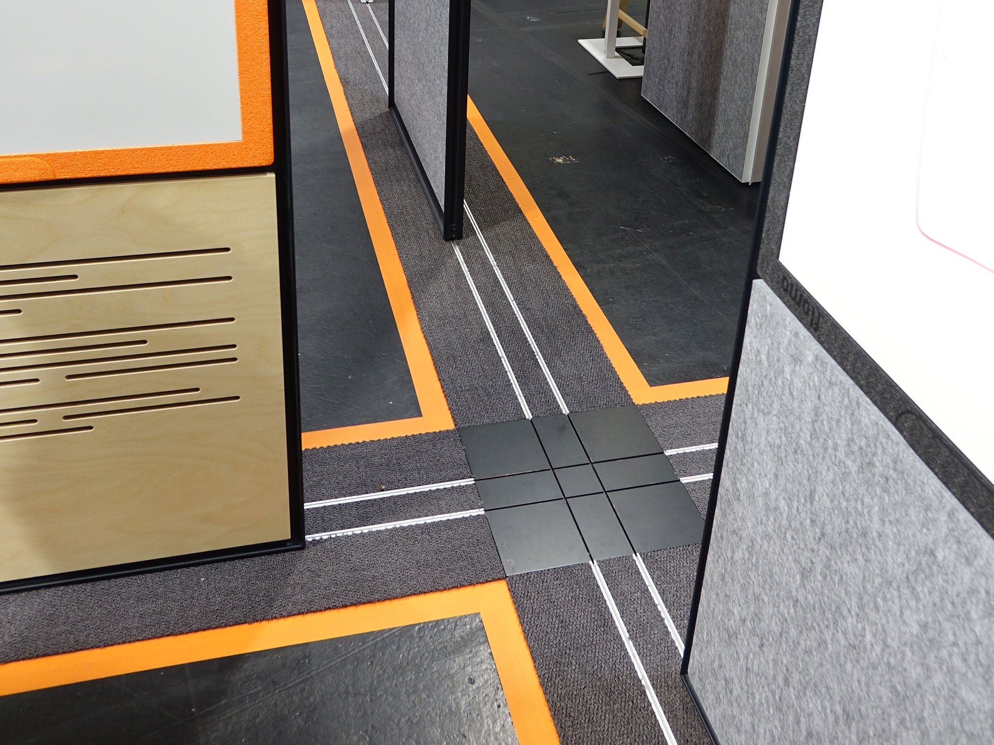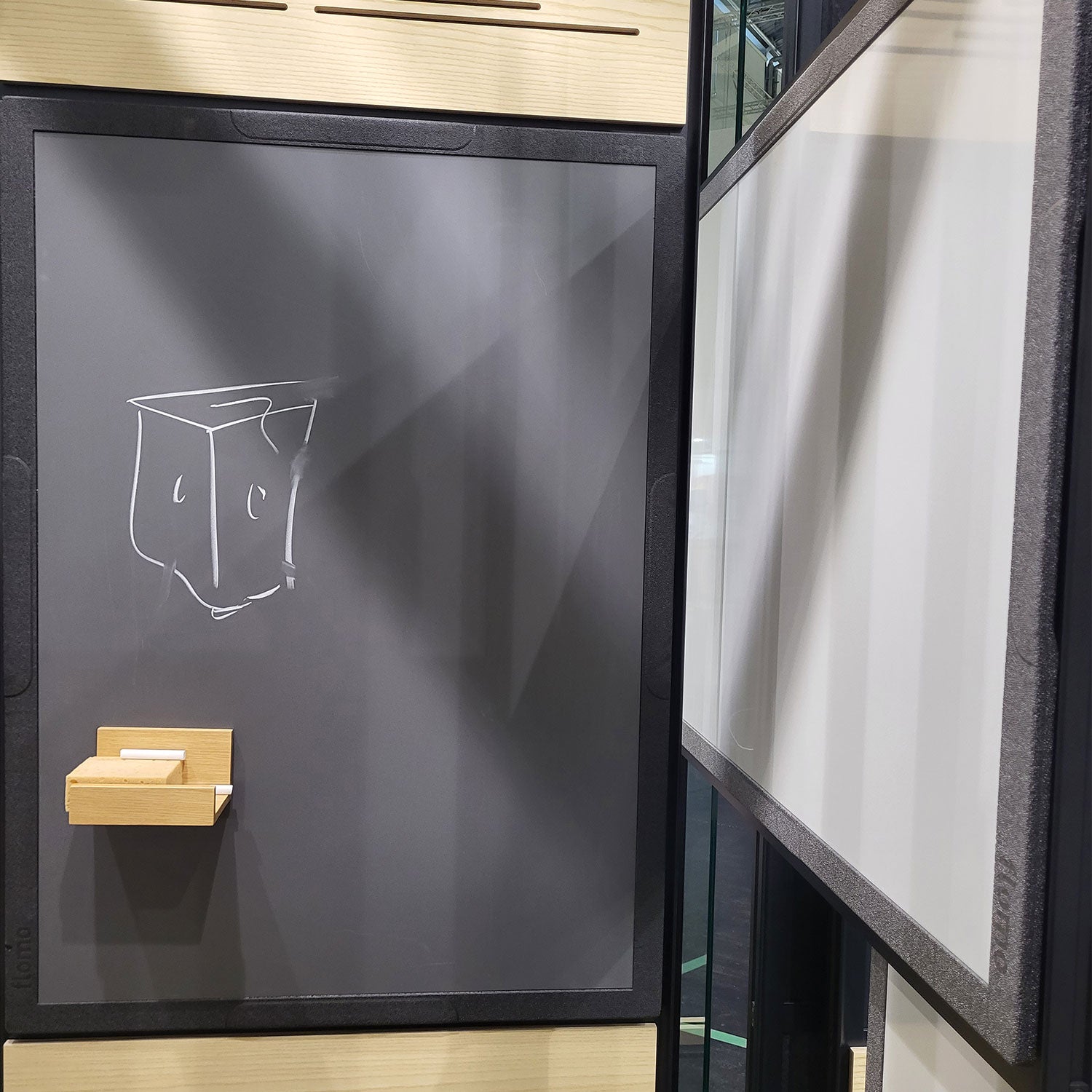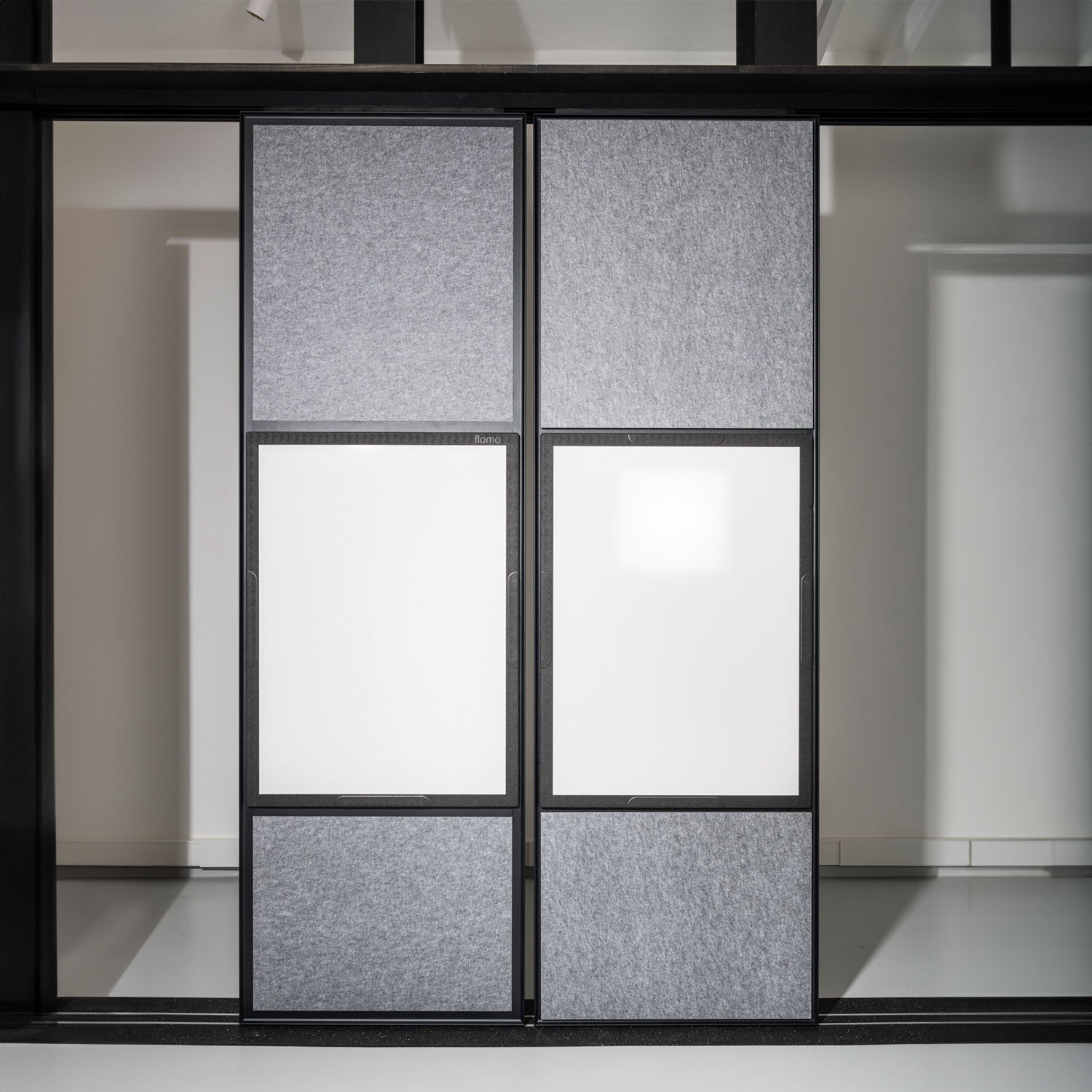 Die flomo wall Trennwand Raumteiler ist in drei Flächen untergliedert. Das flomo board ist stets mittig angeordnet. Die Füllungen der oberen und unteren Fläche können frei gewählt werden. Innenliegende Füllungen werden fest montiert. Aufliegende Füllungen können durch Magnete oder Einhängefunktion flexibel befestigt oder abgenommen werden. Geführt wird die flomo wall in flomo tracks an Decke und Boden und fungiert somit als Raumteiler. Die flomo wall läuft dank eingelassener Rollen leise und fast wie von selbst – ein-, zwei- oder dreiläufig.
